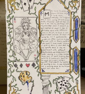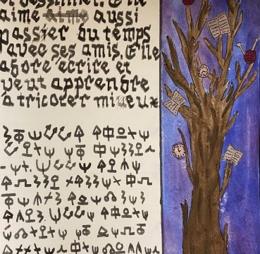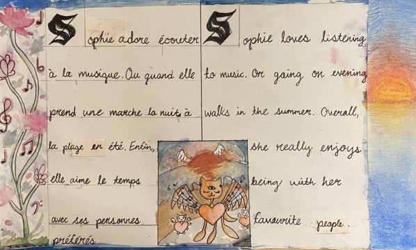 “I usually have students work on an artists bio at the beginning of the quarter. When Mr. Dube said his class was doing an illuminated manuscript project that touched on similar ideas it seemed like the perfect opportunity to combine the two. Students wrote a few sentences about themselves in French and English (and in some cases Polish, Korean, Japanese or any other languages they wanted to translate), and then illustrated them in a style that was influenced by what they had learned about illuminated manuscripts. Because this is a multimedia class they were able to use various kinds of art paper, ink, calligraphy pens, stamps, water colour, oil pastel, and anything else that gave them the look they were trying to capture.”