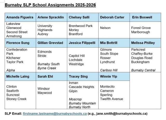 Speech-Language Pathologists (SLPs) in Burnaby Schools assess and treat communication disorders. These may include articulation, language, stuttering, social communication difficulties, and augmentative communication needs.