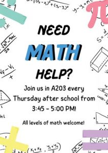 The afterschool math tutorial will take place every Thursday from 3:45 to 5:00pm in room A203. Students will have the support of a math teacher as well as volunteer peer-tutors. The tutorial is a great place for students to seek additional math support, as well as a place where they can complete their homework.