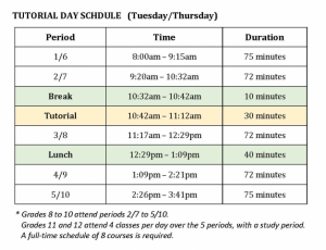 There is time every Tuesday and Thursday from 10:42am to 11:12am that is set aside for tutorial time. Students are free to see the teacher of their choosing for extra support in whichever subject they feel they need. This is a great opportunity for students to ask questions, clarify concepts or work on assigned homework questions.