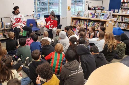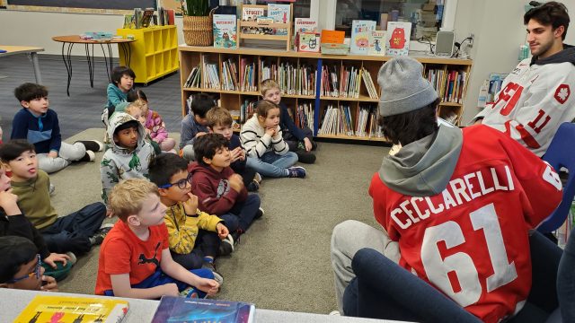 Instead of skates and sticks, the SFU players brought picture books and big smiles. Classes gathered in the library, where each athlete chose a favorite children’s book to share. The players talked about how reading helps them stay focused, learn new strategies, and succeed both on and off the rink. Their visit showed our students that strong minds are just as important as strong muscles. Many kids were thrilled to discover that even college athletes love storytime!